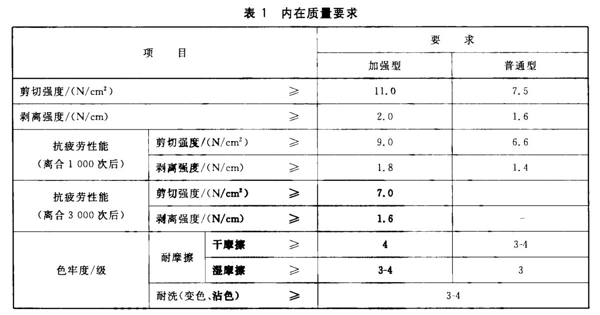 粘扣帶按抗疲勞性能不同可分為普通型和加強(qiáng)型。內(nèi)在質(zhì)量指標(biāo)要求: