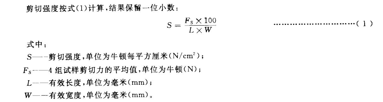 剪切強(qiáng)度是在規(guī)定的試驗(yàn)條件下,將粘扣帶有效閉合區(qū)域沿其長度方向以恒定速度拉伸,使鉤面帶和圈面帶平行分開每單位面積所需的最大力。