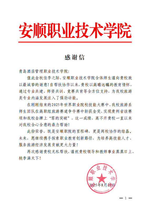 近日,青島酒店管理職院收到來自貴州安順職業(yè)技術(shù)學(xué)院的一封感謝信,對學(xué)校助力其在2025年世界職業(yè)院校技能大賽旅游賽道金獎(jiǎng)實(shí)現(xiàn)“零的突破”表示感謝,對學(xué)校幫扶協(xié)作工作的成效予以高度評價(jià)。