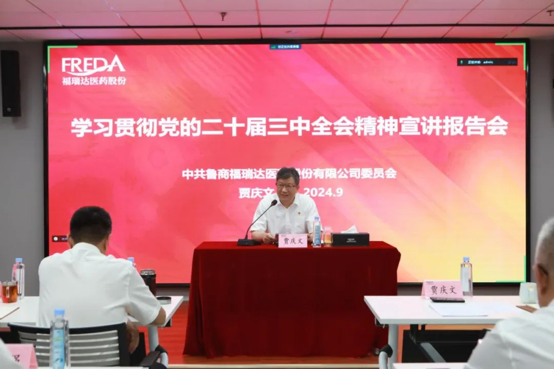 報告會上,賈慶文緊緊圍繞習近平總書記在黨的二十屆三中全會上的重要講話精神和全會《決定》,對全會的基本情況,以及深刻認識進一步全面深化改革、推進中國式現代化的重大意義和總體要求等進行全面系統(tǒng)解讀,對《決定》提出的進一步全面深化改革重大舉措,尤其是國資國企改革舉措進行深入闡釋,并結合福瑞達實際,就抓好全會精神學習貫徹、推動改革舉措落實落地作出安排部署。